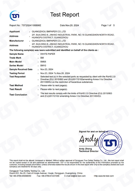 मानक:RoHS Certificate संख्या:TST20241106896E मुद्दा तिथि:2024-11-28 समाप्ति दिनांक:2026-11-28 कार्यक्षेत्र/श्रेणी:Paper and Paperboard द्वारा जारी किया गया:Dongguan True Safety Testing Co., Ltd |