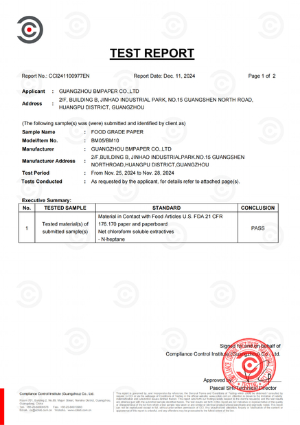 मानक:FDA संख्या:CANHG2119940101 मुद्दा तिथि:2021-11-02 समाप्ति दिनांक:2030-11-01 कार्यक्षेत्र/श्रेणी:Brown paper द्वारा जारी किया गया:SGS |